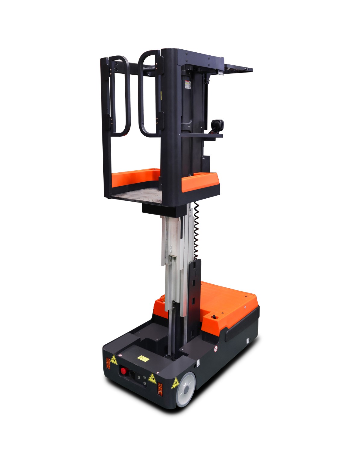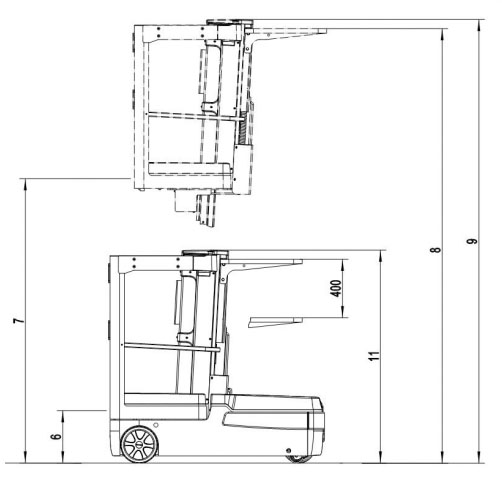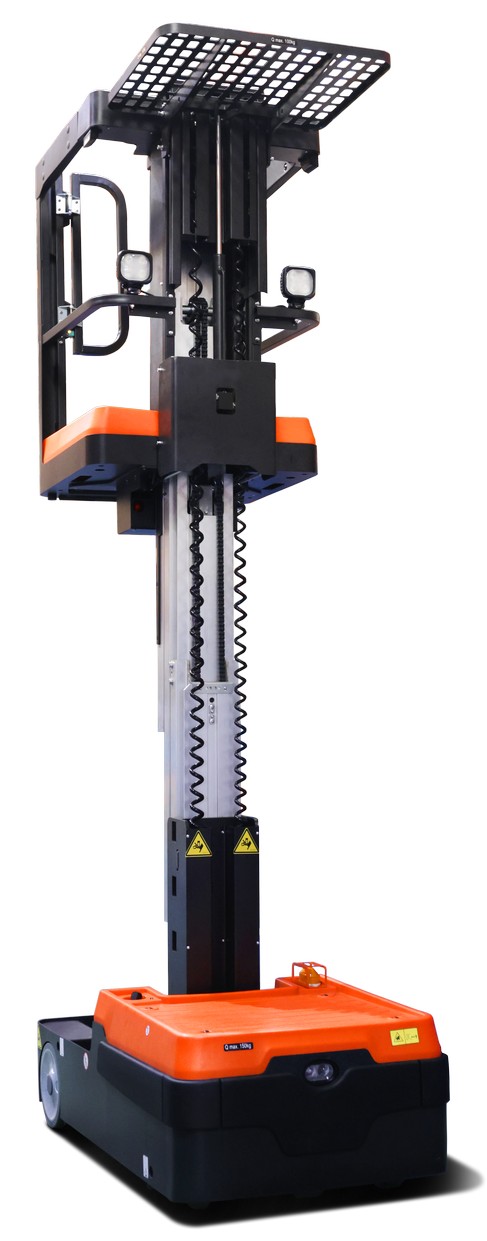 Функции замедления скорости. Для обеспечения устойчивости техники и безопасности оператора, пока платформа поднимается на максимальную высоту, максимально доступные скорости подъема и привода будут регулироваться в три этапа в соответствии со следующими диапазонами высот подъема платформы: скорость движения 5,5 км/час при положении платформы по высоте 0-500 мм, скорость 3,2 км/час при 500-1500 мм, при поднятии платформы на высоты 1500-3000 мм скорость ограничивается в 1,4 км/час. Рабочая высота может достигать 5 метров, что позволяет собирать материалы с третьего уровня стеллажа.