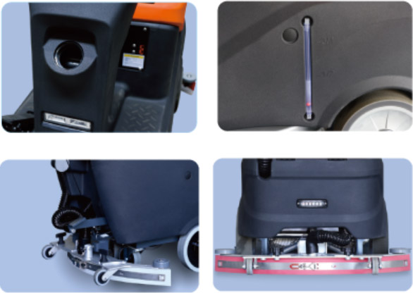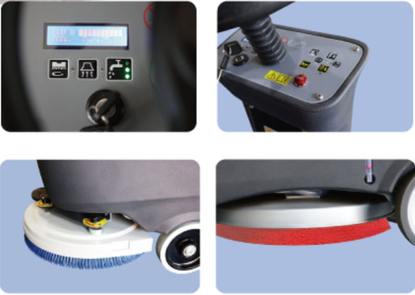 — Инновационная конструкция линейных приводов поддерживает электрический подъем и опускание щетки и держателя скребка одной кнопкой, автоматический подъем держателя скребка для движения задним ходом, что является безопасным и эффективным.