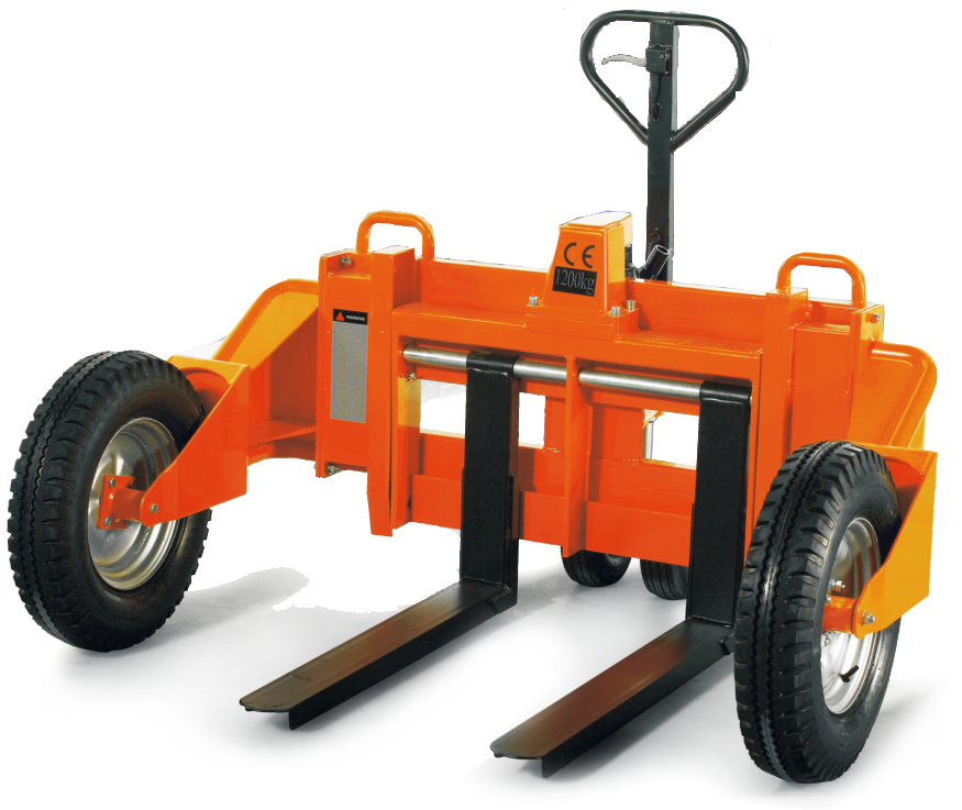 Тележка для бездорожья предназначена для перевозки поддонов с грузом по неровным поверхностям, полам, грунтовой дороге. Гидравлическая тележка повышенной проходимости грузоподъемностью 1200 кг, длиной вил 860 мм. Рохля с большими колесами (пневматическими).