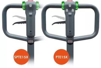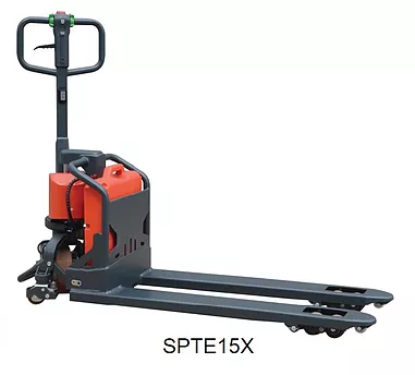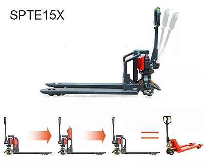 Полуэлектрическая самоходная тележка (рохля) SPTE15X оснащена AC двигателем хода, но в отличие от модели PTE15X (электророхля с электроподъемом вил), подъем вил осуществляется вручную, как у ручной гидравлической тележки, что в случае разряда аккумулятора позволяет использовать ее как ручную тележку.